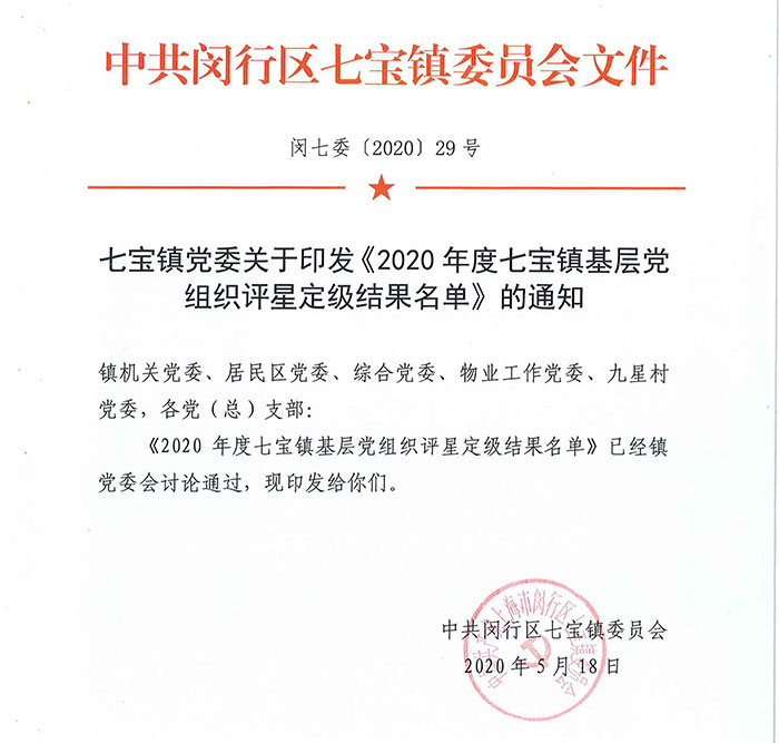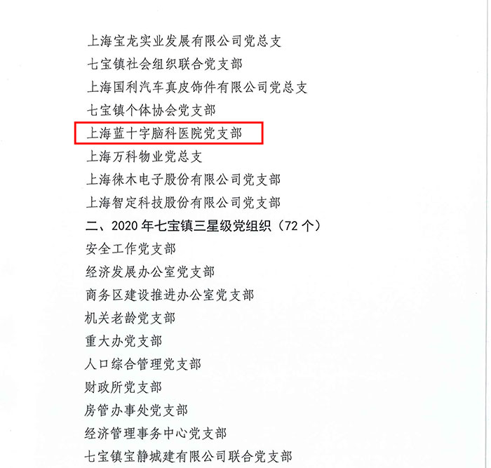 近日,中共閔行區(qū)七寶鎮(zhèn)委員會(huì)下發(fā)《2020年度七寶鎮(zhèn)基層黨組織評(píng)星定級(jí)結(jié)果名單》的通知,上海藍(lán)十字腦科醫(yī)院黨支部獲評(píng)“四星級(jí)黨組織”殊榮。