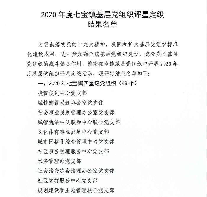 基層黨組織星級(jí)評(píng)定,是閔行區(qū)加強(qiáng)基層黨組織規(guī)范化建設(shè)的一項(xiàng)重要舉措。星級(jí)黨組織評(píng)選秉承公平、公開(kāi),公正為原則,結(jié)合評(píng)星定級(jí)參考標(biāo)準(zhǔn),嚴(yán)格評(píng)定,四星級(jí)是中共閔行區(qū)七寶鎮(zhèn)委員會(huì)評(píng)定的最高等級(jí)。