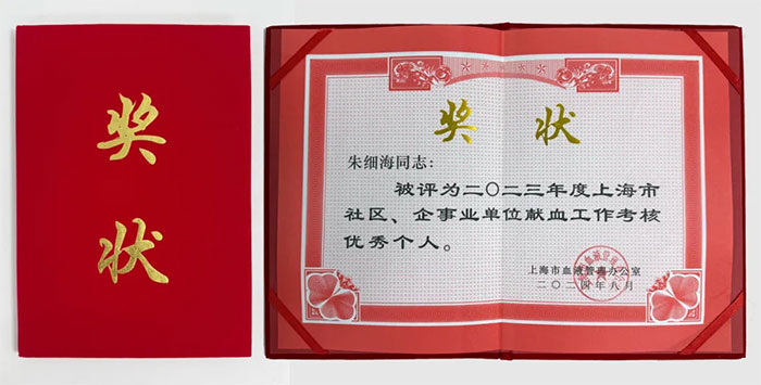 ▲ 朱細(xì)海科長(zhǎng)被評(píng)為2023年度上海市社區(qū)、企事業(yè)單位獻(xiàn)血工作考核優(yōu)秀個(gè)人。