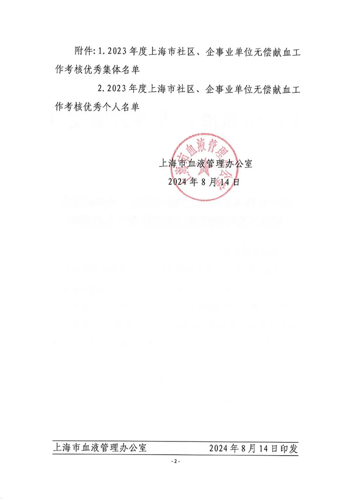 根據(jù)上海市血液管理辦公室發(fā)布《關(guān)于表?yè)P(yáng)2023年度上海市社區(qū)、企事業(yè)單位獻(xiàn)血工作考核優(yōu)秀集體和優(yōu)秀個(gè)人的通知》【滬血辦(2024)38號(hào)】,為弘揚(yáng)無(wú)償獻(xiàn)血新風(fēng)尚,經(jīng)各區(qū)血液管理機(jī)構(gòu)推薦,市血液管理辦公室審核,表?yè)P(yáng)全市286家單位為年度上海市社區(qū)、企事業(yè)單位無(wú)償獻(xiàn)血工作考核優(yōu)秀集體;上海藍(lán)十字腦科醫(yī)院【同濟(jì)大學(xué)附屬上海藍(lán)十字腦科醫(yī)院(籌)】醫(yī)務(wù)科朱細(xì)海科長(zhǎng)等230名同志為2023年度上海市社區(qū)、企事業(yè)單位無(wú)償獻(xiàn)血工作考核優(yōu)秀個(gè)人。