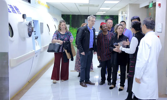 參觀過程中,他們對醫(yī)院業(yè)務(wù)開展、學(xué)科建設(shè)、特色醫(yī)療技術(shù)、設(shè)施設(shè)備等表現(xiàn)出濃厚的興趣,并進(jìn)行了現(xiàn)場交流。值得一提的是,在高壓氧科,規(guī)模宏大的氧艙群讓專家代表們眼前一亮,大家駐足良久,紛紛拿出手機拍照留念。