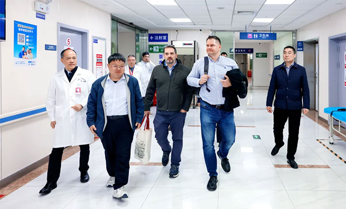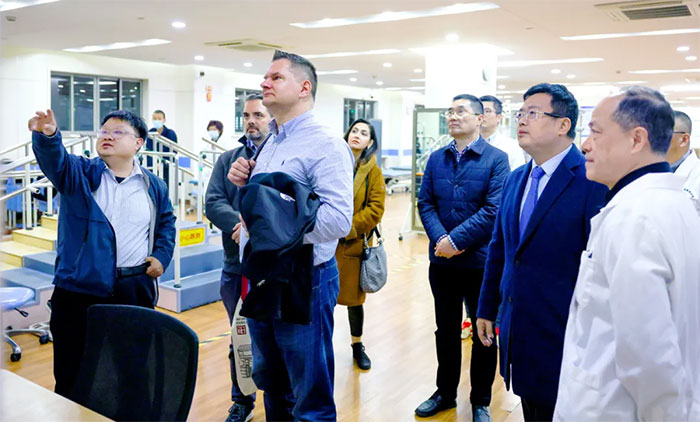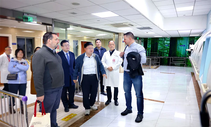 Dean Krusienski博士、Gerwin Schalk博士、金晶教授一行抵達醫(yī)院后,在朱敏書記、項耀鈞院長等的陪同下,實地參觀考察了醫(yī)院康復(fù)醫(yī)學(xué)科、高壓氧科、醫(yī)學(xué)影像科等重點特色科室,并與科室主任及醫(yī)護人員進行了互動交流。