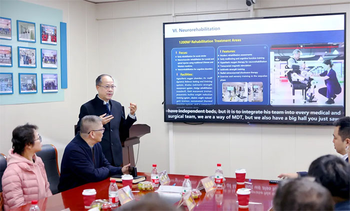 座談交流環(huán)節(jié),項耀鈞院長從發(fā)展歷程、學(xué)科建設(shè)、優(yōu)勢技術(shù)、設(shè)施設(shè)備、愿景規(guī)劃、國際交流與合作等方面介紹了醫(yī)院情況。項院長指出,醫(yī)院致力于不斷探索腦科學(xué)先進技術(shù)的研究和臨床應(yīng)用,于2021年與華東理工大學(xué)建立合作,成為其腦機接口技術(shù)臨床應(yīng)用基地。雙方在推動腦機接口技術(shù)于意識障礙患者評估應(yīng)用方面取得了可喜的臨床效果,成功促醒多名慢性意識障礙昏迷患者。