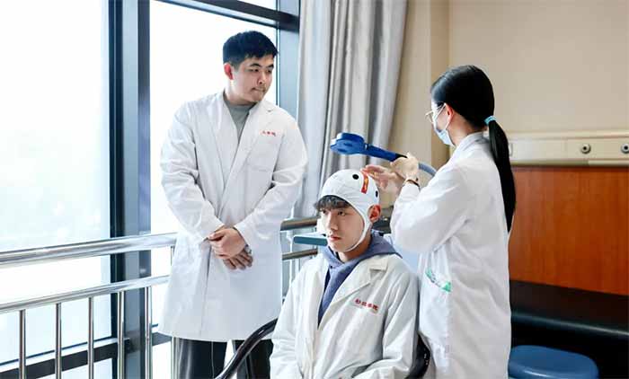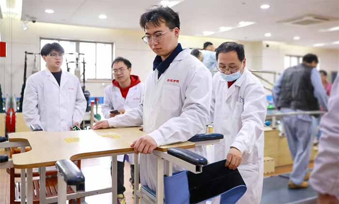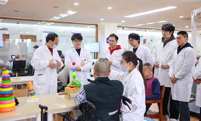 在醫(yī)院1200平方米的多功能康復(fù)大廳,部分患者正在治療師的指導(dǎo)下進(jìn)行康復(fù)訓(xùn)練。沈志祥博士向?qū)W生們介紹,醫(yī)院以神經(jīng)專科為特色,神經(jīng)康復(fù)主要圍繞神經(jīng)系統(tǒng)疾病或損傷導(dǎo)致的功能障礙,通過綜合、規(guī)范、個(gè)體化的康復(fù)手段,促進(jìn)神經(jīng)功能重塑,改善運(yùn)動(dòng)、感覺、認(rèn)知、言語、吞咽及日常生活能力,幫助患者最大程度恢復(fù)社會(huì)參與能力。他強(qiáng)調(diào),神經(jīng)康復(fù)不是輔助治療,而是神經(jīng)系統(tǒng)疾病整體治療中不可或缺的重要部分。