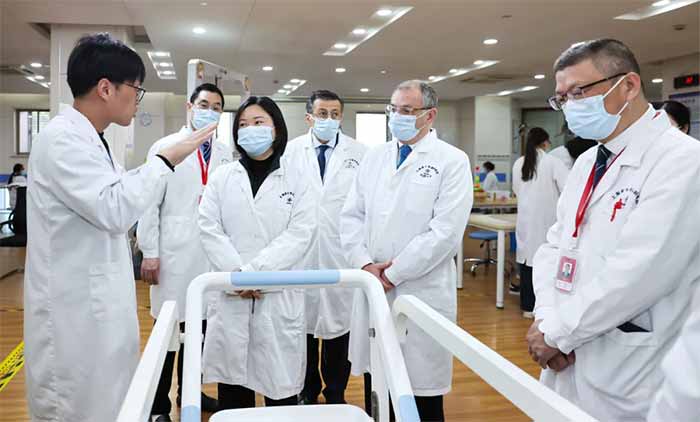 上午8時(shí)30分,UCM神經(jīng)腫瘤部主任Youssef G. Comair博士、綜合卒中中心聯(lián)合主任Fernando Goldenberg博士一行,在上海藍(lán)十字腦科醫(yī)院書記朱敏、院長項(xiàng)耀鈞等院領(lǐng)導(dǎo)的陪同下,先后深入醫(yī)院手術(shù)室、9F重癥醫(yī)學(xué)科、8A神經(jīng)內(nèi)六科、7A神經(jīng)內(nèi)三科、6B神經(jīng)外二科、康復(fù)科、放療科、高壓氧科等科室參觀,了解醫(yī)院在腦病診療領(lǐng)域的學(xué)科布局與臨床實(shí)踐。