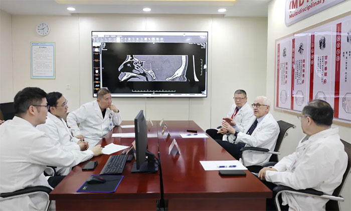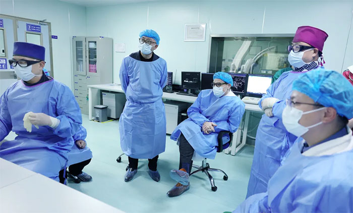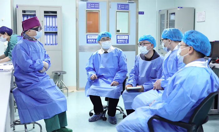 術(shù)前間隙,Sean P.Polster博士詳細(xì)了解了患者病情、手術(shù)適應(yīng)癥、手術(shù)方式選擇、介入策略等情況,并與醫(yī)護團隊進行了經(jīng)驗交流和智慧碰撞。手術(shù)過程中,席剛明教授、王貴平博士等配合默契、一絲不茍、技藝嫻熟精湛,給Sean P.Polster博士留下深刻印象。