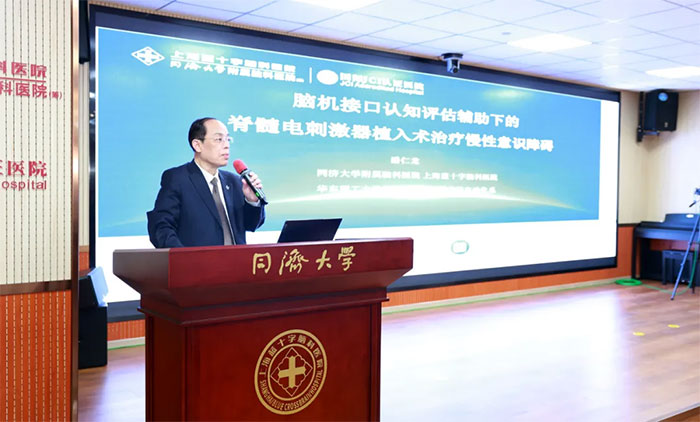 藍(lán)十字潘仁龍主任率先分享了《腦機(jī)接口認(rèn)知評(píng)估輔助下的脊髓電刺激器植入術(shù)治療慢性意識(shí)障礙》主題報(bào)告,以藍(lán)十字作為國(guó)家重點(diǎn)實(shí)驗(yàn)室華東理工大學(xué)腦機(jī)接口技術(shù)臨床應(yīng)用基地、建立腦復(fù)蘇中心為例,展示了創(chuàng)新技術(shù)與臨床診療相結(jié)合的方法和應(yīng)用成果,強(qiáng)調(diào)腦機(jī)接口認(rèn)知評(píng)估輔助下的脊髓電刺激器植入術(shù)應(yīng)用前景廣闊,為慢性意識(shí)障礙患者帶來(lái)了新的突破和希望。