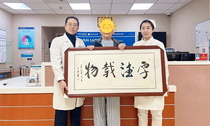 朱老伯為腦干及雙側(cè)大腦半球多發(fā)腔隙性腦梗塞患者,昏迷,病情反復(fù),甚至一度危及生命。經(jīng)急診、李振并主任團隊及多學(xué)科專家力挽狂瀾,精心救治。如今,朱老伯不僅蘇醒,肢體功能也日漸向好。“當(dāng)時一定要120救護車送來醫(yī)藍(lán)十字搶救,現(xiàn)在看來是對的!”朱老伯動情地表示,并分別為急診科和5A團隊送來錦旗和書法牌匾。原來,朱老伯妻子曾在李振并主任處診治,對醫(yī)院的專業(yè)能力和服務(wù)質(zhì)量非常認(rèn)可,當(dāng)時家屬便堅持要求120將朱老伯送來藍(lán)十字,遂有了朱老伯這番感慨。