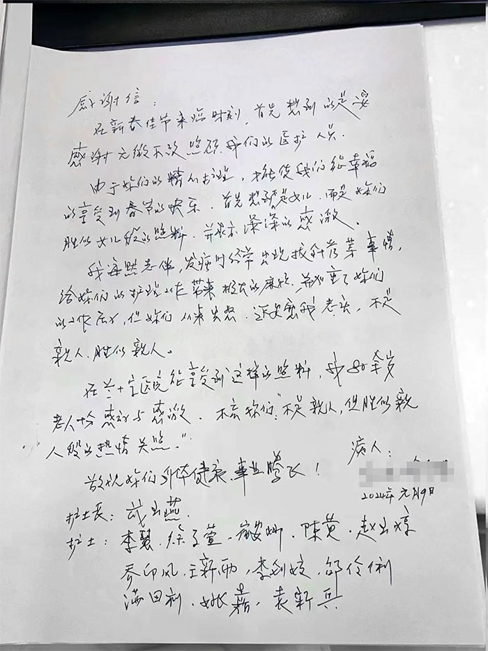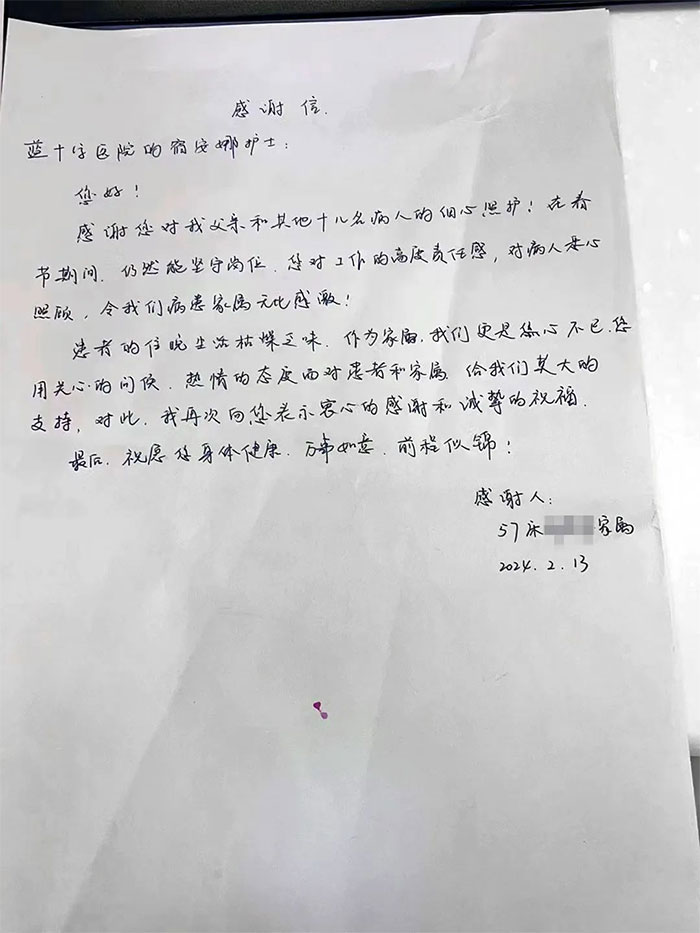 此外,還有更多醫(yī)護“輕易/輕傷不下火線,始終堅守崗位”,如7B馬娜等醫(yī)生連續(xù)值班,下夜班后也依舊在崗;因兄長新年,殷昌鳳主任匆忙返回老家后,初四便返崗;護士謝童童、董梓一等高燒,毅然堅持在崗;護士崔慧慧夜班后仍堅持在崗。以及5B病區(qū)雷蕾醫(yī)生、黃秀娟醫(yī)生、左宗耀醫(yī)生等以敬業(yè)、奉獻(xiàn)等獲得好評。大年三十,雷蕾醫(yī)生因精心治療和敬業(yè)精神,收到患者3000元紅包,婉拒無果后,將“紅包”充進患者住院賬戶。左宗耀醫(yī)生初四返崗,因耐心負(fù)責(zé),和護士劉文一同收到患者感謝信。