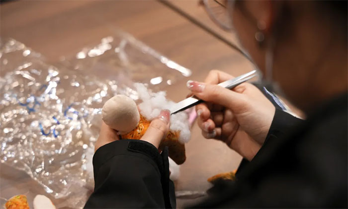 活動(dòng)現(xiàn)場,大家紛紛化身手工藝人。“這里的棉花應(yīng)該放多少?”“艾草包味道真好聞呢!”在丁志萍老師的悉心指導(dǎo)下,大家全情投入到非遺手作中,認(rèn)真地將棉花填充進(jìn)香囊,加入小巧的艾草包,專注地穿針、打結(jié)、縫邊,為自己的兔子香囊精心搭配個(gè)性化裝飾......