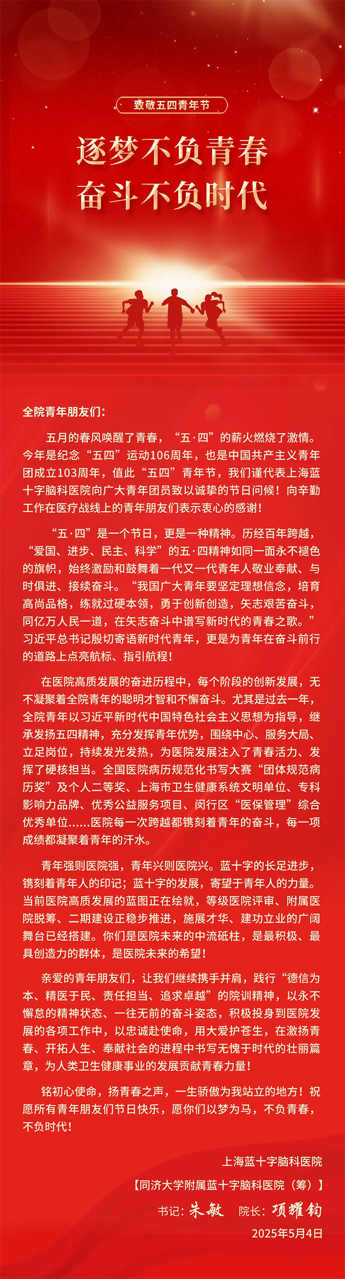 五月的春風(fēng)喚醒了青春,“五·四”的薪火燃燒了激情。今年是紀(jì)念“五四”運(yùn)動(dòng)106周年,也是中國共產(chǎn)主義青年團(tuán)成立103周年,值此“五四”青年節(jié),我們謹(jǐn)代表上海藍(lán)十字腦科醫(yī)院向廣大青年團(tuán)員致以誠摯的節(jié)日問候!向辛勤工作在醫(yī)療戰(zhàn)線上的青年朋友們表示衷心的感謝!