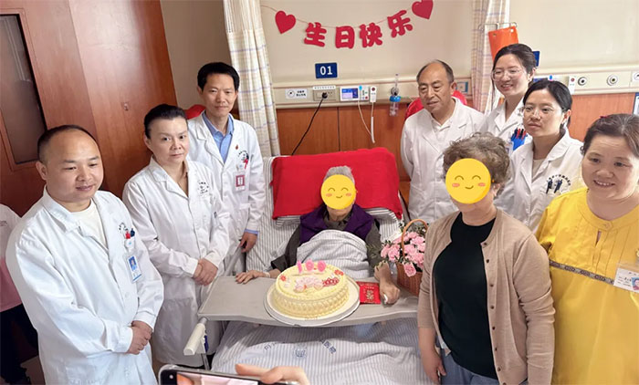 “祝你生日快樂,祝你生日快樂......”5月2日,5B神經(jīng)內(nèi)二科病房溫馨而又熱鬧。當(dāng)天是患者鄔阿婆的百歲生辰。李振東主任、余志良副主任、黃朵朵護(hù)士長等精心布置病房,帶領(lǐng)科室醫(yī)護(hù)人員同唱生日歌,送上祝福與鮮花,為阿婆慶祝生日。阿婆臉上洋溢著幸福笑容,家屬也對醫(yī)護(hù)團(tuán)隊(duì)的悉心照料表達(dá)了由衷感謝。“有時(shí)去治愈,常常去幫助,總是去安慰”,在藍(lán)十字,這樣的醫(yī)患溫情故事經(jīng)常上演。他們以愛為底色,將節(jié)日的溫暖守護(hù)與陪伴傳遞,使醫(yī)療更有情懷,人文更有價(jià)值。