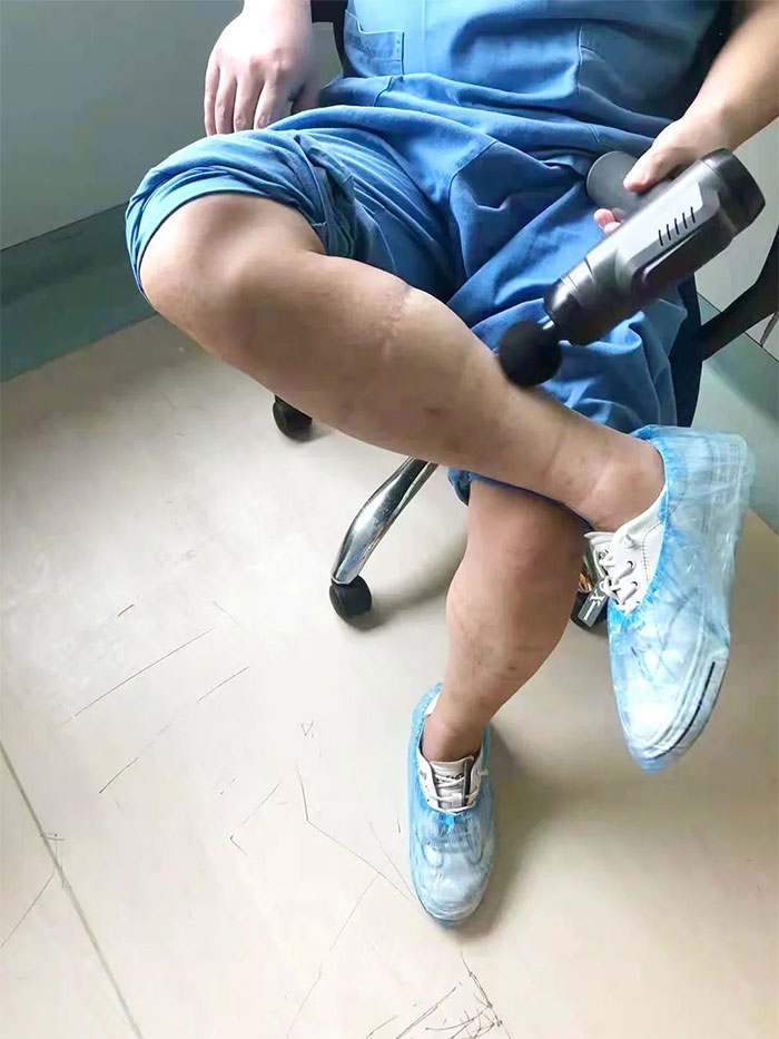 轉(zhuǎn)運大廳地面不平整,影響物資轉(zhuǎn)運,虎哥看到了,默默地用自己的巧手化解難題……等到弄完回到科室,脫下防護(hù)服那一刻,一地的汗水和滿是勒痕的雙腿,仿佛在訴說著虎哥今天的故事。