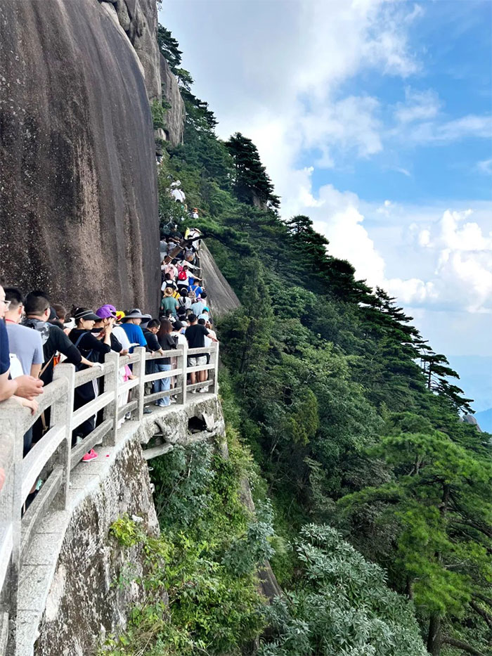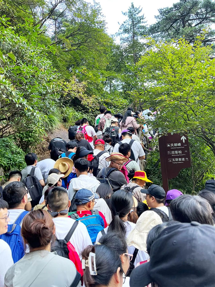 登山之路遠比想象的艱險,特別是從光明頂?shù)接退蛇@段路程,山勢雄偉險峻,加之“人從眾”爬山模式,約1.5公里的路程,團隊耗費了近3個小時。