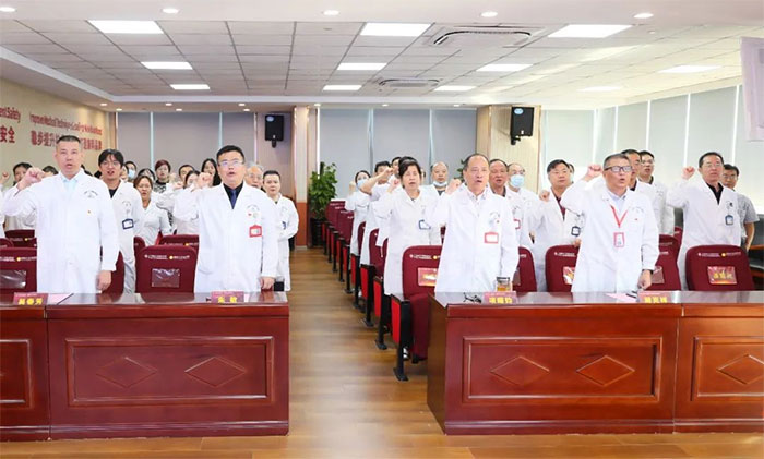 “我志愿獻(xiàn)身人類的健康事業(yè);自覺(jué)維護(hù)醫(yī)學(xué)的尊嚴(yán)和神圣;敬佑生命,救死扶傷……”副院長(zhǎng)潘耀良帶領(lǐng)現(xiàn)場(chǎng)所有醫(yī)師重溫《中國(guó)醫(yī)師宣誓誓詞》。大家舉起右拳,像正式成為一名醫(yī)生那天一般虔誠(chéng),莊重宣誓。