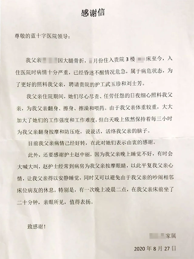此外,還要感謝(責任)護士趙中麗,因為我父親晚上睡覺不好,有時會大喊大叫,趙護士經(jīng)常到病房為我父親按摩眼睛,以此平復我父親心情,讓我父親得以安靜睡覺,同時又可以避免由于我父親的吵鬧(影響)相鄰床位病友的休息。特別是,有一次晚上凌晨二點,在我父親床前坐了二十分鐘,親眼所見,值得表揚。
