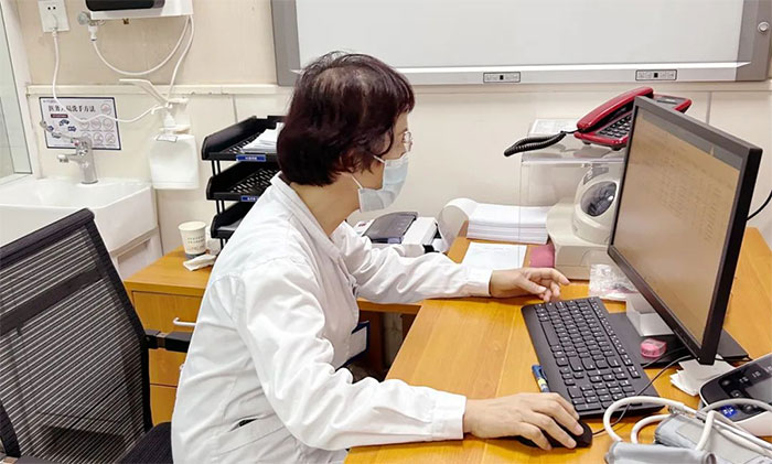 ▲ 內(nèi)科門診余琪主任帶傷堅持坐診