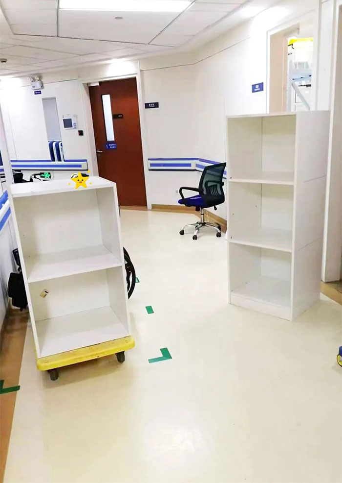 總務(wù)科副科長柯石鑾、汪嘉偉,消防管理員陳偉智,保安隊長吳偉松,采購姚愛群,維修組電工師傅(張仁龍、陸洪其、王錫彬、江永彬、齊云)等自愿放棄休假,選擇堅守崗位,時刻準備著為在崗人員及在院患者提供所需的支持和保障。在做好本職工作之余,維修組電工師傅王錫彬重新拾起自己的木工手藝,變廢為寶,利用休息時間,對從食堂撤下來的木板進行加工改造,做成兩個儲物柜為7B腦血管病科庫房所用。