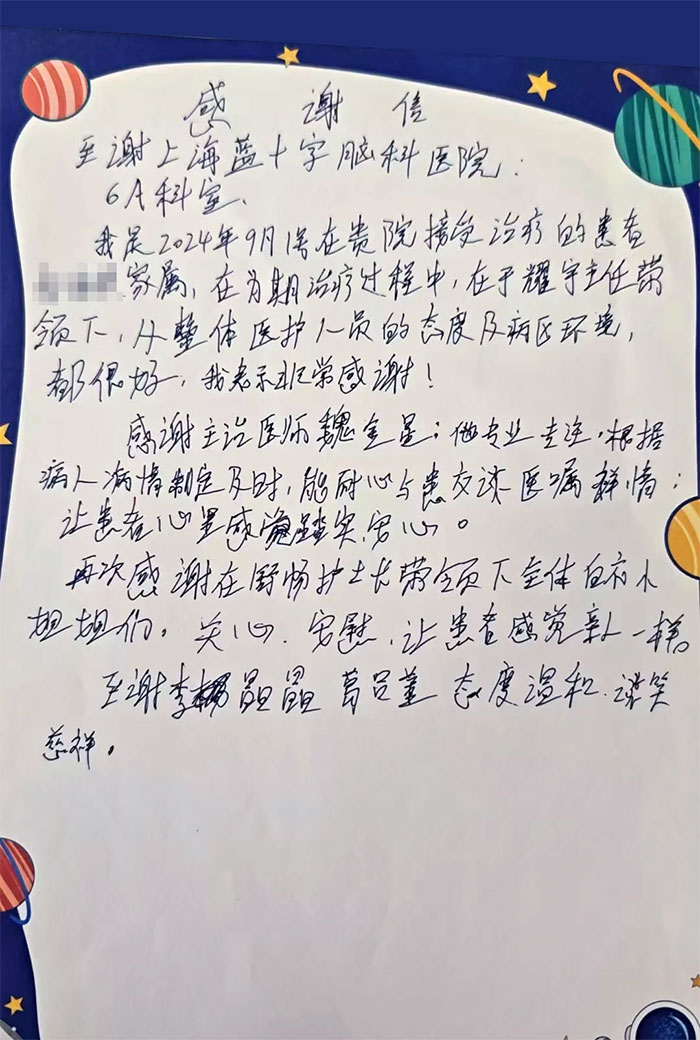 “我的父親.....在藍(lán)十字腦科醫(yī)院做治療,幾次都有生命危險(xiǎn),在8B所有醫(yī)院人員、陳主任、醫(yī)生們的細(xì)心照料下,從原來(lái)的昏迷不醒,到現(xiàn)在逐漸清醒,意識(shí)也有很大康復(fù),感謝所有醫(yī)護(hù)人員盡心盡力的照顧、耐心的給我們解答不懂的地方,再次感謝所有的醫(yī)護(hù)人員,感謝有你們。”