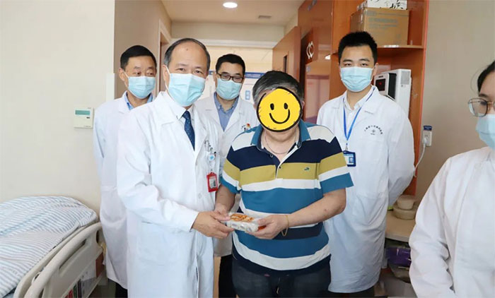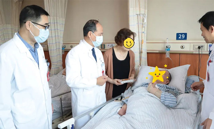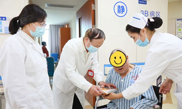 6A病區(qū)的金奶奶是一名退休教師,因腦梗死、骨折等入住醫(yī)院,入院時臥床、生活不能自理、不識人,一度病危,經過精心救治、護理及康復,如今已能下床行走,也能認得親友。在中國傳統(tǒng)節(jié)日重陽節(jié)收到朱敏總經理送來的重陽糕和慰問,金奶奶及家屬十分感動。“感謝院領導的關心,想得這么周到;感謝醫(yī)生護士的精心照護。謝謝!”金奶奶的家屬說到。在親友的鼓勵下,金奶奶現(xiàn)場吟誦了王維的詩歌《九月九日憶山東兄弟》。