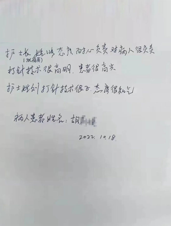 “小張(張福英)態(tài)度耐心負責,對(患者)很負責,打針技術(shù)很高明,患者很高興。護士姓劉(劉非凡)打針技術(shù)很好,態(tài)度很和氣......”