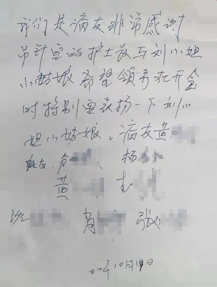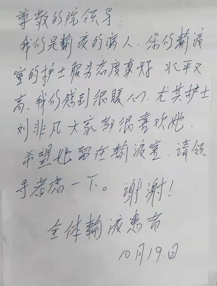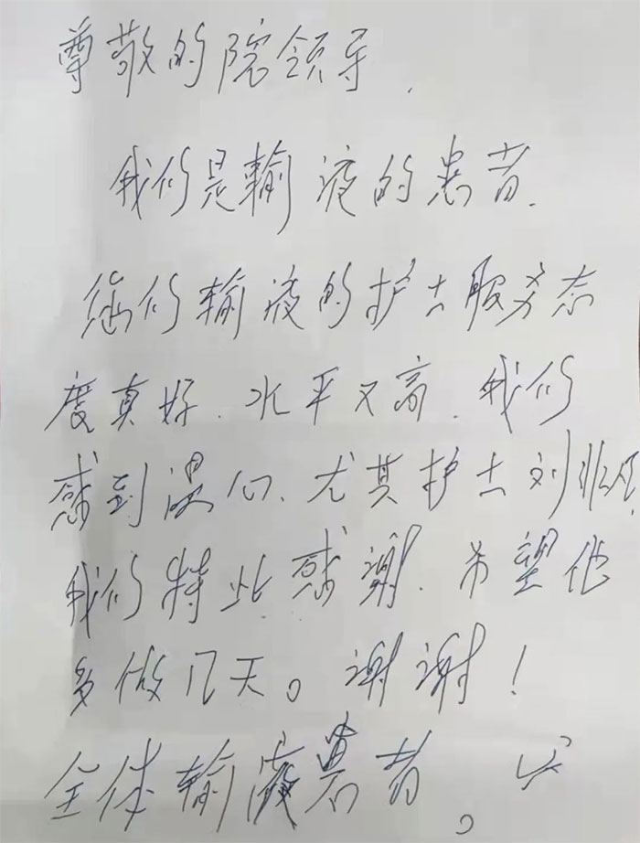 “我們是病友,非常感謝吊針室的張小姐和劉小姐小姑娘,希望領(lǐng)導在開會時特別要表揚一下......”