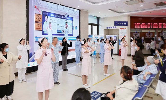 為進(jìn)一步增強(qiáng)科普效果,活動(dòng)還設(shè)置視頻展播與互動(dòng)教學(xué)環(huán)節(jié)。上海藍(lán)十字腦科醫(yī)院5A神經(jīng)內(nèi)二科李蘭馨護(hù)士長(zhǎng)團(tuán)隊(duì)帶來曾獲2024年閔行區(qū)護(hù)理科普講解大賽三等獎(jiǎng)的科普作品《動(dòng)起來,不要被“栓”住》。該作品以真實(shí)案例為切入點(diǎn),通過生動(dòng)視頻畫面與通俗解說,將專業(yè)血栓知識(shí)轉(zhuǎn)化為易懂的生活常識(shí)。隨后,李蘭馨護(hù)士長(zhǎng)團(tuán)隊(duì)現(xiàn)場(chǎng)演示“預(yù)防深靜脈血栓操”,并帶領(lǐng)觀眾跟練。現(xiàn)場(chǎng)氣氛活躍,不少患者反饋:“動(dòng)作簡(jiǎn)單實(shí)用,在床上就能練習(xí),非常方便!”