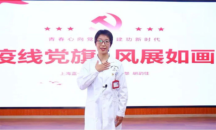 胡韻佳演講的主題是——《疫線黨旗 風(fēng)展如畫》。她以身邊5位青年黨員/入黨積極分子鮮活的抗疫事例為串聯(lián),描述了藍(lán)十字青年聞“疫”即動、沖鋒在前的感人故事,展示了新時代藍(lán)十字人的青春風(fēng)采和精神風(fēng)貌。