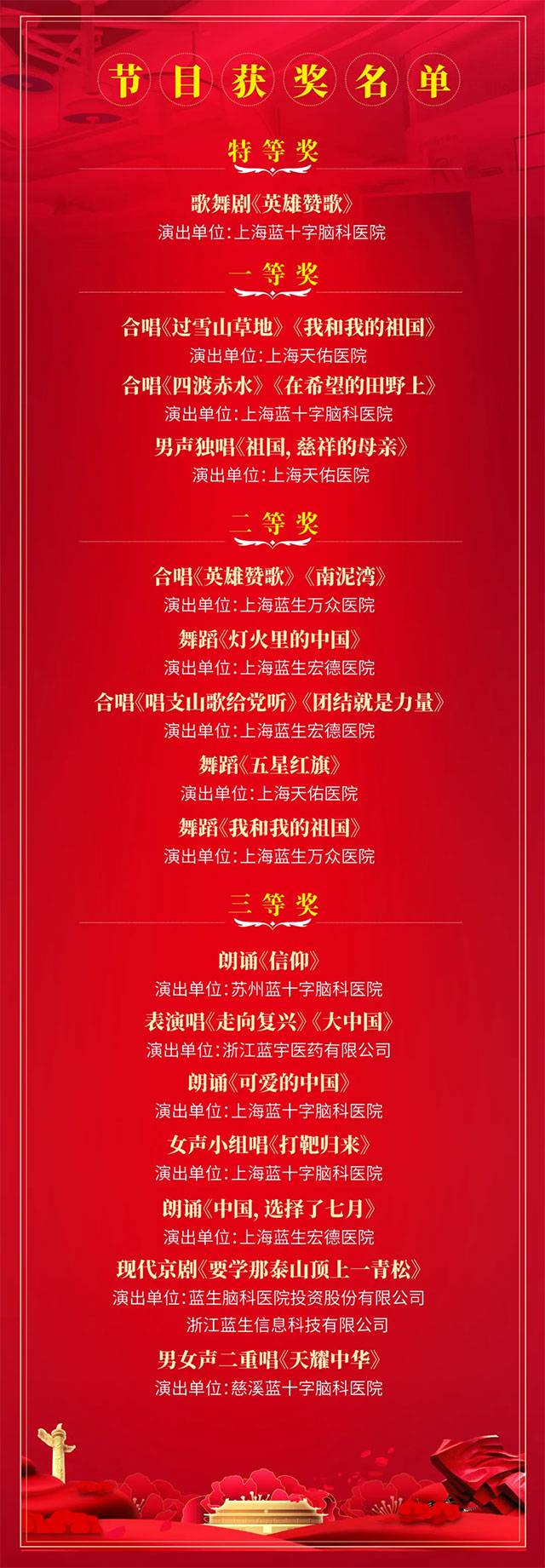 本次匯演共評(píng)選出特等獎(jiǎng)1個(gè)、一等獎(jiǎng)3個(gè)、二等獎(jiǎng)5個(gè)、三等獎(jiǎng)7個(gè)。