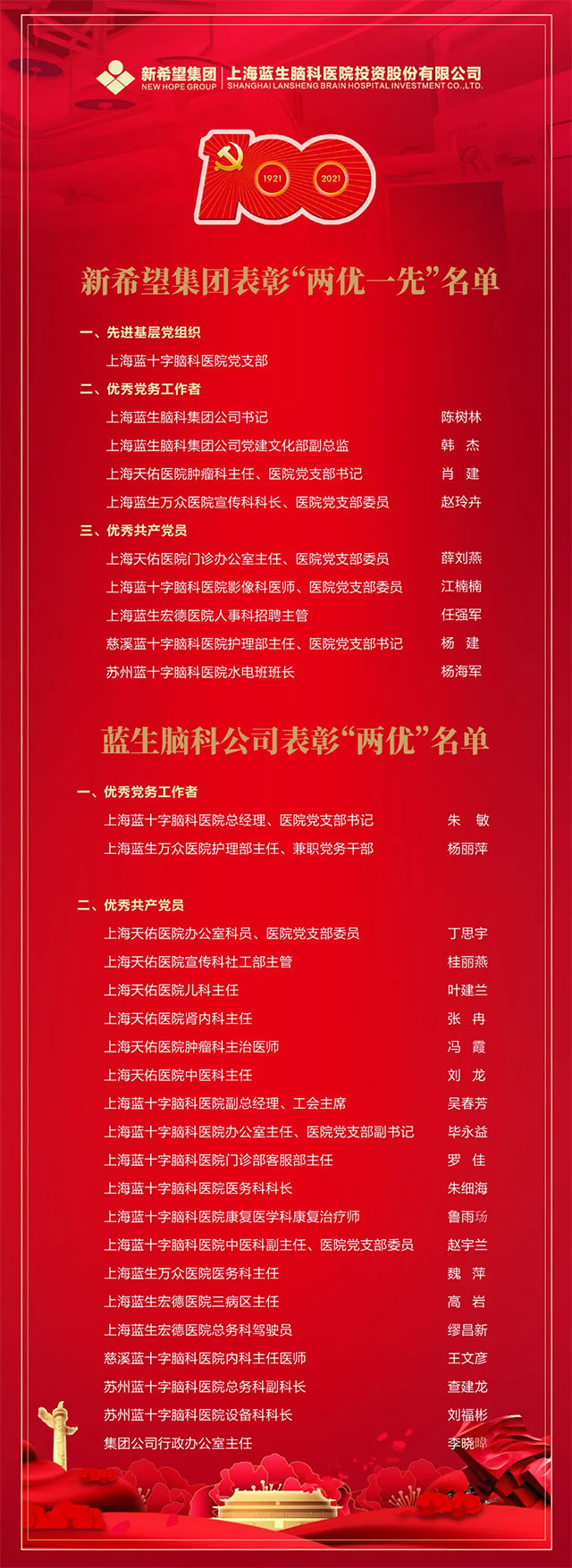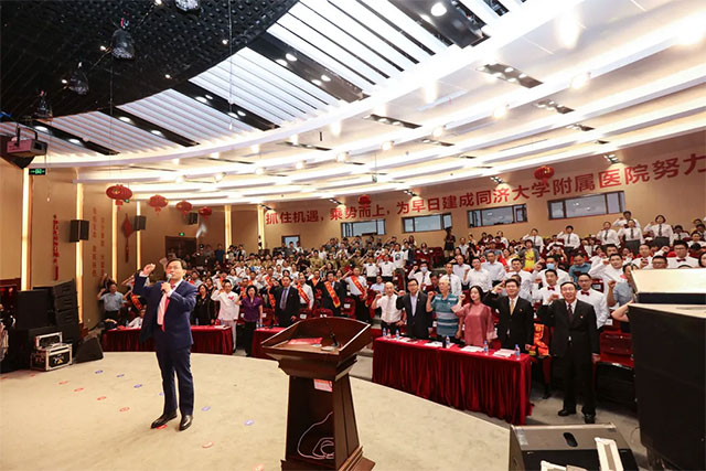 胸懷千秋偉業(yè),百年恰是風(fēng)華正茂。中國(guó)共產(chǎn)黨百年華誕前夕,6月29日下午,公司在同濟(jì)大學(xué)附屬天佑醫(yī)院國(guó)際會(huì)議廳,隆重舉辦慶祝中國(guó)共產(chǎn)黨成立100周年表彰大會(huì)暨文藝匯演,回顧黨的輝煌歷程,謳歌黨的豐功偉績(jī),表彰黨建先進(jìn)典型,感悟黨的寶貴經(jīng)驗(yàn)啟示。公司董事長(zhǎng)卓立強(qiáng)同志等公司領(lǐng)導(dǎo)、機(jī)關(guān)干部,醫(yī)院、子公司班子成員,科室主任和護(hù)士長(zhǎng)代表,外聯(lián)項(xiàng)目領(lǐng)導(dǎo)、儲(chǔ)備人才和“兩優(yōu)一先”表彰對(duì)象共330余人出席。上海市衛(wèi)生健康委員會(huì)新聞宣傳處處長(zhǎng)艾曉金、上海新華傳媒連鎖有限公司黨委書記鈕也仿、前金盾藝術(shù)團(tuán)導(dǎo)演丁勇斌、上海市越劇院國(guó)家一級(jí)演員鄧華蔚蒞臨會(huì)議指導(dǎo)。公司常務(wù)副總裁劉詩(shī)強(qiáng)同志主持表彰大會(huì)。