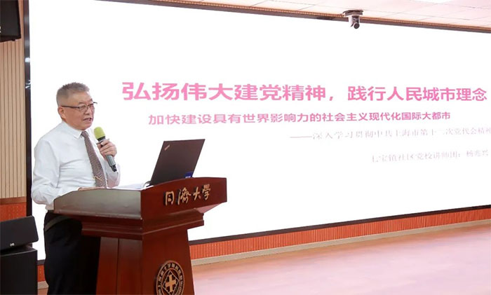 楊兆興老師以詼諧幽默的開場白,引領(lǐng)著所有人踏上了學習的快車。他從“中共上海市第十二次黨代會概況”、“牢記囑托,砥礪奮進的五年”、“加快建設(shè)具有世界影響力的社會主義現(xiàn)代化國際大都市”、“奮力開創(chuàng)各項事業(yè)發(fā)展新局面”、“以偉大建黨精神引領(lǐng)新時代黨建偉大工程”五個方面,結(jié)合自身的經(jīng)歷和感受,以簡潔的語言、生動的案例、翔實的數(shù)據(jù),深入淺出地解讀了《中共上海市第十二次黨代會報告》。