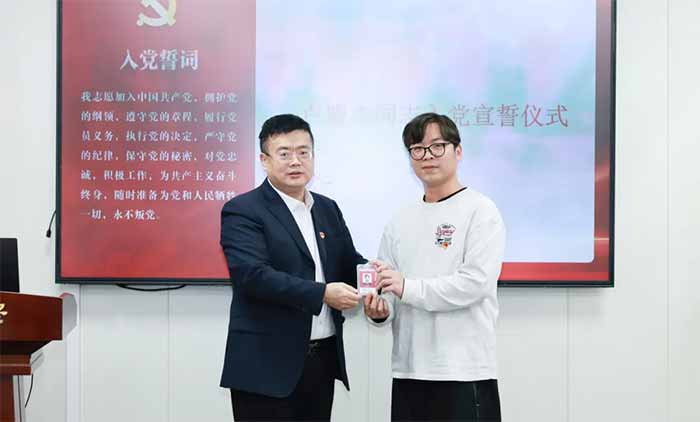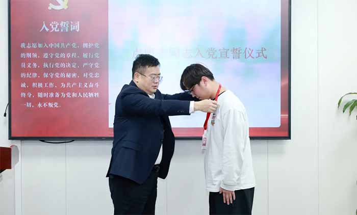 全體與會黨員整齊肅立,共同回望奮斗歷程,堅定理想信念。在朱敏書記的領(lǐng)誓下,預(yù)備黨員盧盟杰佩戴黨徽,面向鮮紅的中國共產(chǎn)黨黨旗,舉起右拳莊嚴宣誓:“我志愿加入中國共產(chǎn)黨,擁護黨的綱領(lǐng),遵守黨的章程……”鏗鏘有力的誓言回蕩在會議室,不僅表達了盧盟杰同志對黨的無限忠誠和為共產(chǎn)主義事業(yè)奮斗終身的堅定決心,也讓在場每一位黨員再次接受了深刻的精神洗禮。
