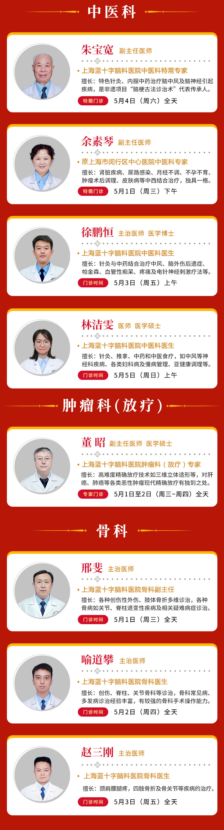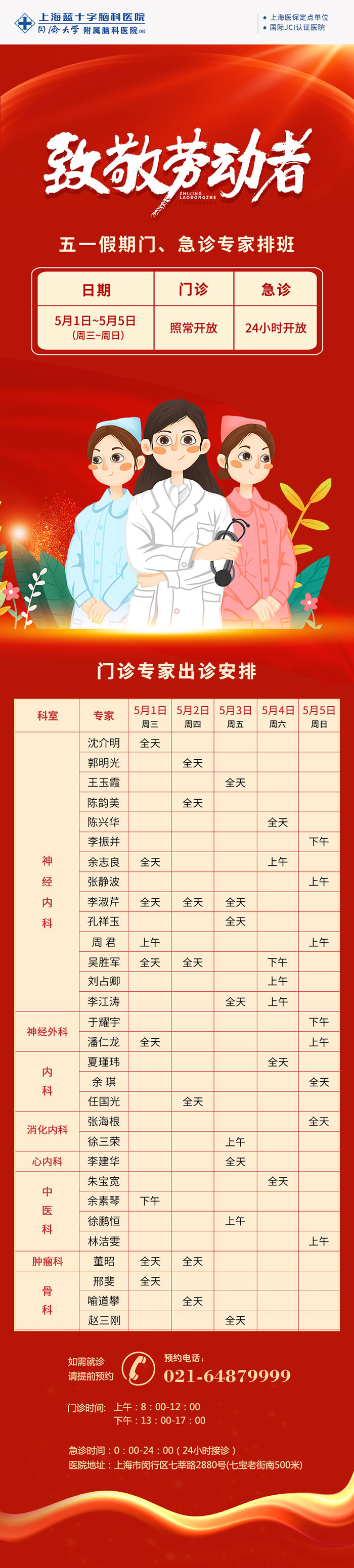 為更好滿足廣大市民朋友的就醫(yī)需求,根據(jù)國務(wù)院有關(guān)法定假日安排的規(guī)定,結(jié)合上海藍(lán)十字腦科醫(yī)院實(shí)際情況,2024年“五一”勞動(dòng)節(jié)假期(5月1日—5日)期間醫(yī)院門、急診照常開診。具體排班公告如下: