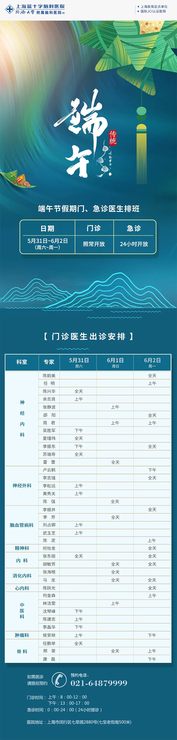 為更好滿(mǎn)足廣大市民朋友的就醫(yī)需求,根據(jù)國(guó)務(wù)院有關(guān)法定假日安排的規(guī)定,結(jié)合上海藍(lán)十字腦科醫(yī)院【同濟(jì)大學(xué)附屬藍(lán)十字腦科醫(yī)院(籌)】實(shí)際情況,2025年端午節(jié)假期5月31日—6月2日(周六至周一)期間醫(yī)院門(mén)、急診照常開(kāi)診。具體排班公告如下: