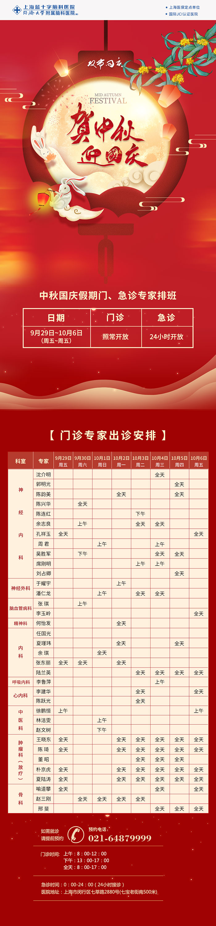為方便廣大市民朋友就醫(yī),根據(jù)國(guó)務(wù)院辦公廳公布的《2023年節(jié)假日安排的通知》精神,我院中秋國(guó)慶假期(9月29日-10月6日)門、急診照常開診。現(xiàn)將具體排班公告如下: