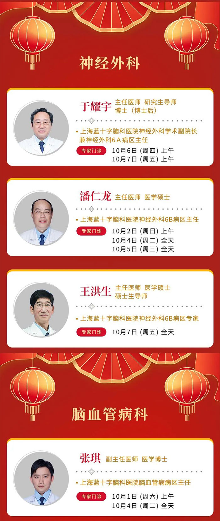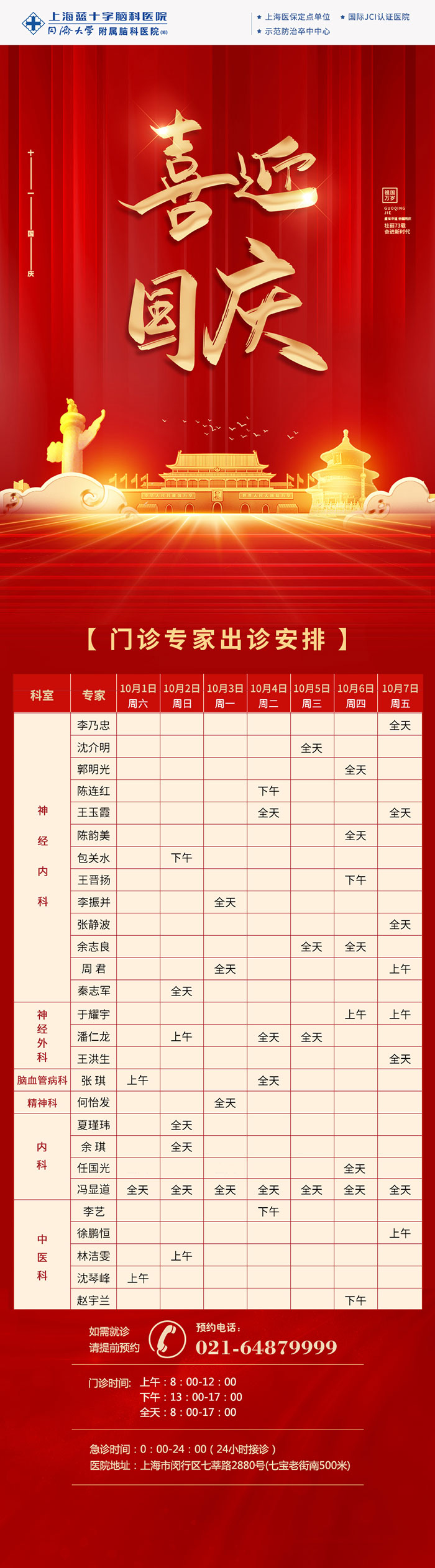 國慶將至,根據(jù)《國務(wù)院辦公廳關(guān)于2022年部分節(jié)假日安排的通知》,在切實做好疫情防控工作的同時,為保障群眾就醫(yī)需求,我院門診照常開放。望各位患友按照上海市疫情防控要求,提前規(guī)劃行程,做好出行安排,盡量預(yù)約就診。詳細門診安排如下: