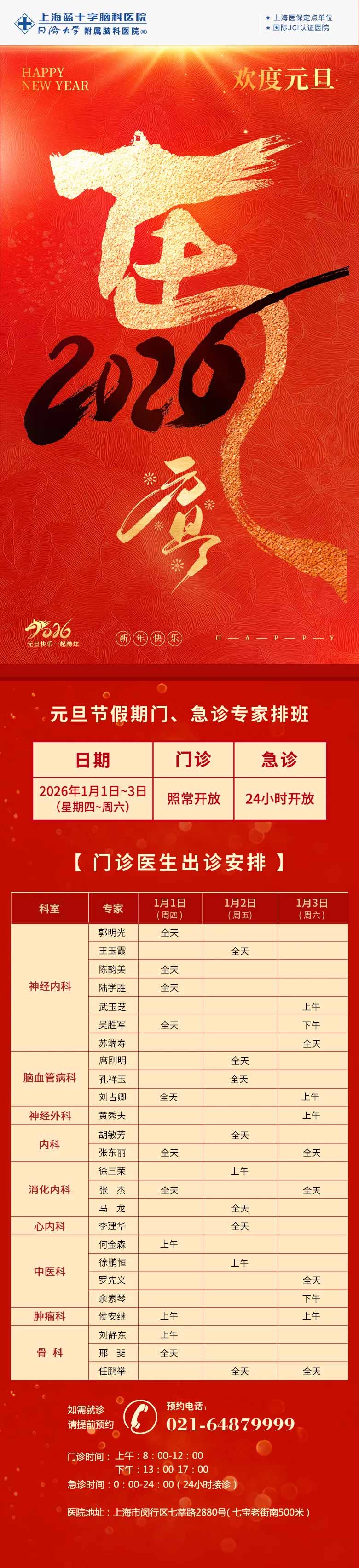 為更好地滿足患者的就診需求,根據(jù)國務(wù)院辦公廳關(guān)于2026年元旦放假安排的通知,結(jié)合醫(yī)院實際情況,2026年1月1日-3日元旦假期期間,我院門、急診照常開放。門急診安排詳情如下: