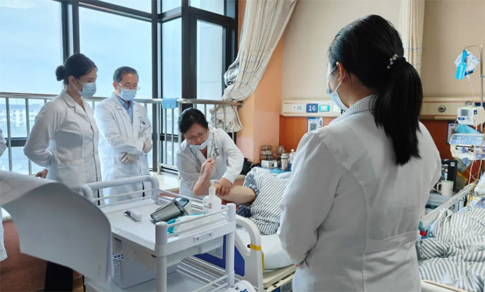 “在這里住院治療效果很好,我兒子剛來(lái)的時(shí)候聽(tīng)不懂我說(shuō)的話,也走不了路,現(xiàn)在可以扶著在病房行走,而且能聽(tīng)懂我說(shuō)的話了,真的很感激醫(yī)生們,特別是管床醫(yī)生,很認(rèn)真負(fù)責(zé)。”在5B神經(jīng)內(nèi)二科病房查房結(jié)束時(shí),一位患者家屬對(duì)神經(jīng)內(nèi)科學(xué)科帶頭人兼5B神經(jīng)內(nèi)二科主任李振東及醫(yī)生們說(shuō)道。這位患者曾在外院多次住院,剛進(jìn)醫(yī)院神經(jīng)內(nèi)科時(shí)處于完全性失語(yǔ)無(wú)法溝通交流、四肢肌力下降不能行走的狀態(tài),經(jīng)科室團(tuán)隊(duì)的不懈努力,目前患者病情得到極大的改善,可以聽(tīng)懂部分言語(yǔ)且可以下床行走,獲得了家屬的肯定。