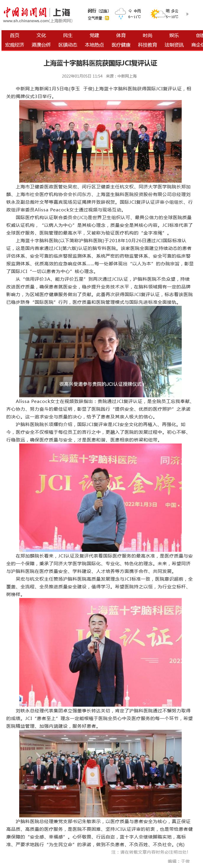 中新網(wǎng)上海新聞1月5日電(李玉 于俊)上海藍(lán)十字腦科醫(yī)院獲得國際JCI復(fù)評認(rèn)證,相關(guān)的揭牌儀式3日舉行。
