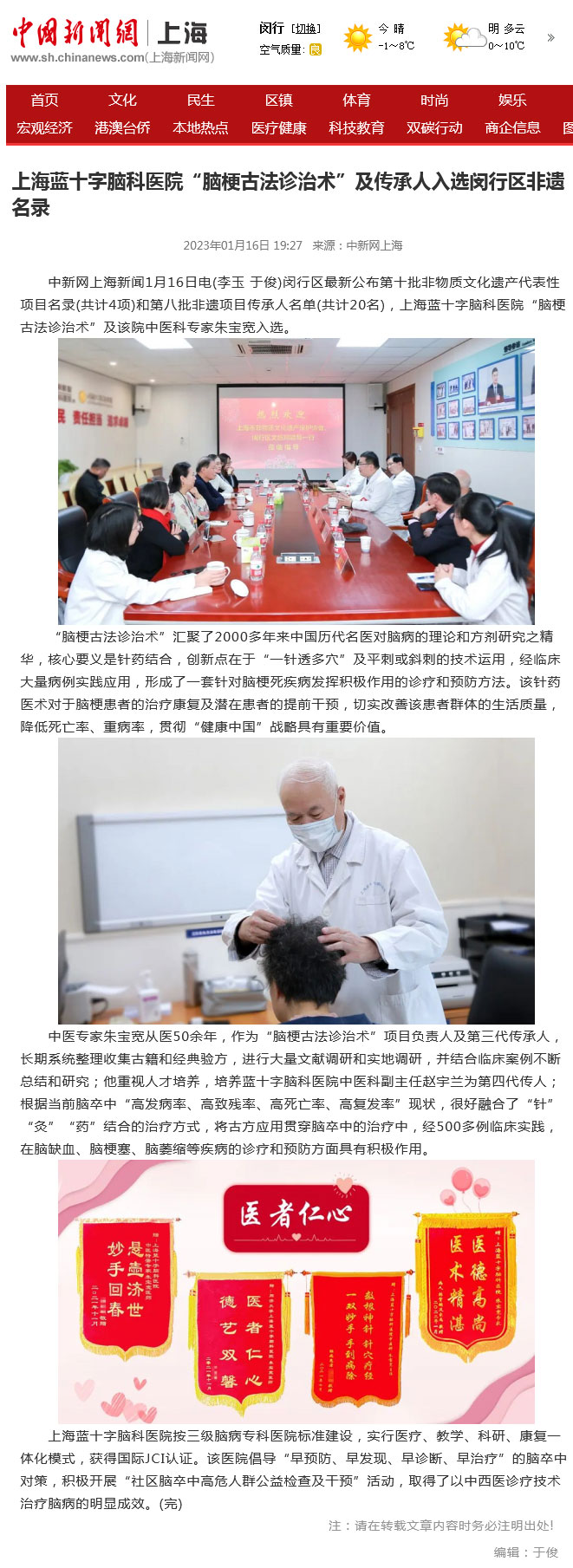 中新網(wǎng)上海新聞1月16日電(李玉 于俊)閔行區(qū)最新公布第十批非物質(zhì)文化遺產(chǎn)代表性項(xiàng)目名錄(共計(jì)4項(xiàng))和第八批非遺項(xiàng)目傳承人名單(共計(jì)20名),上海藍(lán)十字腦科醫(yī)院“腦梗古法診治術(shù)”及該院中醫(yī)科專家朱寶寬入選。