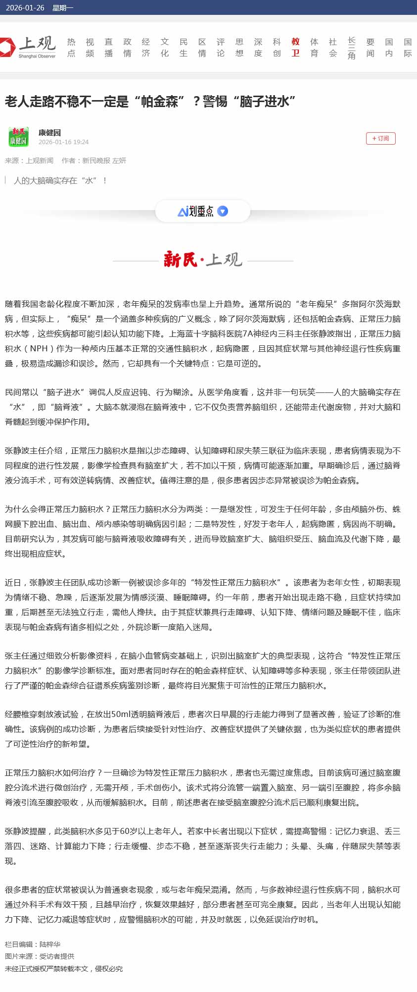 張靜波提醒,此類腦積水多見于60歲以上老年人。若家中長(zhǎng)者出現(xiàn)以下癥狀,需提高警惕:記憶力衰退、丟三落四、迷路、計(jì)算能力下降;行走緩慢、步態(tài)不穩(wěn),甚至逐漸喪失行走能力;頭暈、頭痛,伴隨尿失禁等表現(xiàn)。