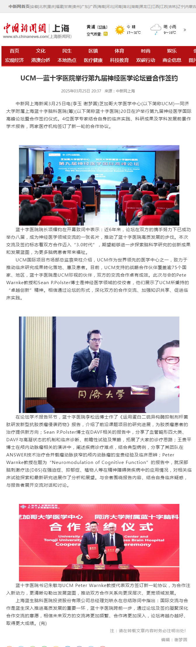 中新網(wǎng)上海新聞3月25日電(李玉 謝夢圓)芝加哥大學(xué)醫(yī)學(xué)中心(以下簡稱UCM)—同濟(jì)大學(xué)附屬上海藍(lán)十字腦科醫(yī)院(籌)(以下簡稱藍(lán)十字醫(yī)院)20日在滬舉行第九屆神經(jīng)醫(yī)學(xué)國際高峰論壇暨合作簽約儀式。4位醫(yī)學(xué)專家結(jié)合自身的臨床實(shí)踐、科研成果及學(xué)科發(fā)展前景作學(xué)術(shù)報(bào)告,兩家醫(yī)療機(jī)構(gòu)簽訂了新一輪的合作協(xié)議。