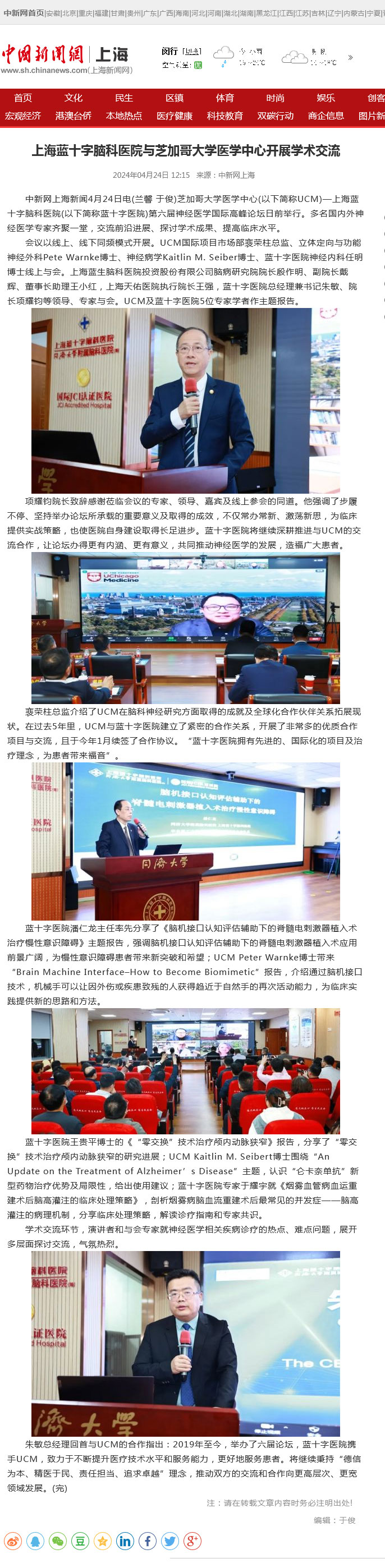 中新網(wǎng)上海新聞4月24日電(蘭馨 于俊)芝加哥大學(xué)醫(yī)學(xué)中心(以下簡(jiǎn)稱UCM)—上海藍(lán)十字腦科醫(yī)院(以下簡(jiǎn)稱藍(lán)十字醫(yī)院)第六屆神經(jīng)醫(yī)學(xué)國(guó)際高峰論壇日前舉行。多名國(guó)內(nèi)外神經(jīng)醫(yī)學(xué)專家齊聚一堂,交流前沿進(jìn)展、探討學(xué)術(shù)成果、提高臨床水平。