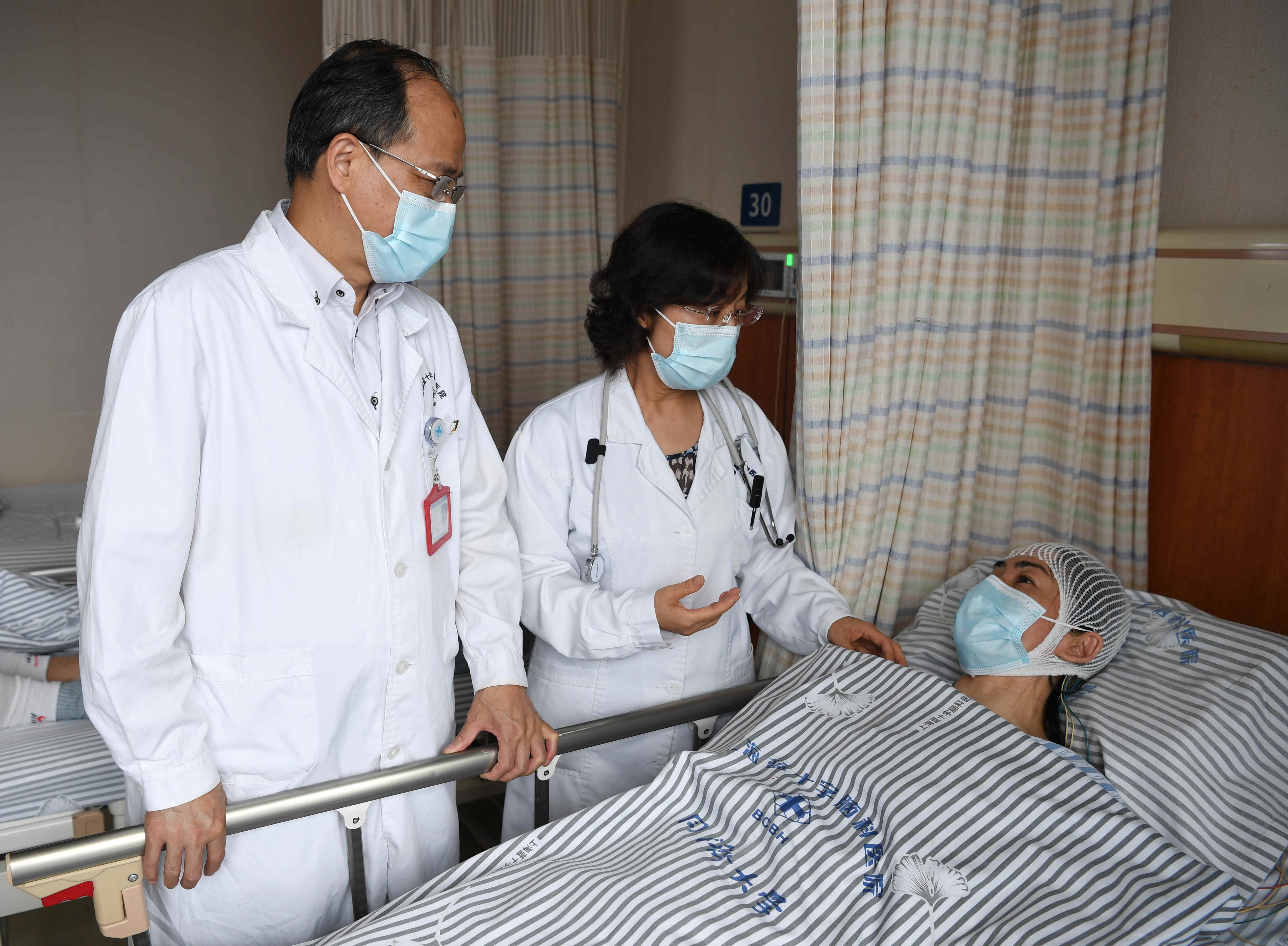 院長項耀鈞教授(左一)與神經(jīng)內(nèi)科主任張靜波在病房探視腦病患者