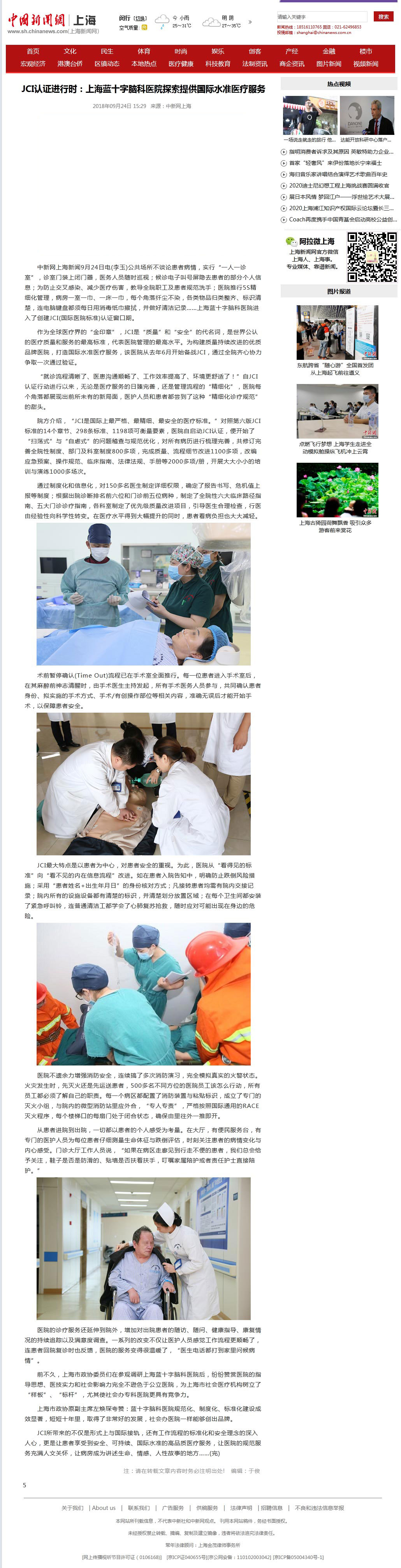 中新網(wǎng)上海新聞9月24日電(李玉)公共場所不談論患者病情,實行“一人一診室”,診室門裝上閉門器,醫(yī)務人員隨時巡視;候診電子叫號屏隱去患者的部分個人信息;為防止交叉感染、減少醫(yī)療傷害,教導全院職工及患者規(guī)范洗手;醫(yī)院推行5S精細化管理,病房一室一巾、一床一巾,每個角落纖塵不染,各類物品歸類整齊、標識清楚,連電腦鍵盤都須每日用消毒紙巾擦拭,并做好清潔記錄……上海藍十字腦科醫(yī)院進入了創(chuàng)建JCI(國際醫(yī)院標準)認證窗口期。