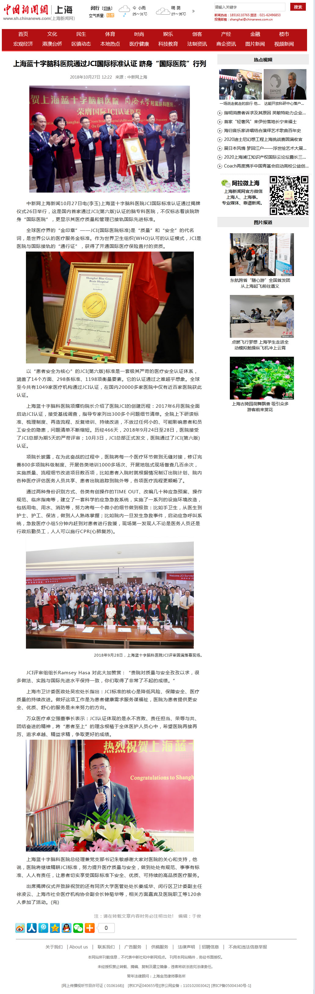 中新網(wǎng)上海新聞10月27日電(李玉)上海藍(lán)十字腦科醫(yī)院JCI國際標(biāo)準(zhǔn)認(rèn)證通過揭牌儀式26日舉行,這顯示其醫(yī)療質(zhì)量和管理已接軌先進(jìn)標(biāo)準(zhǔn)。