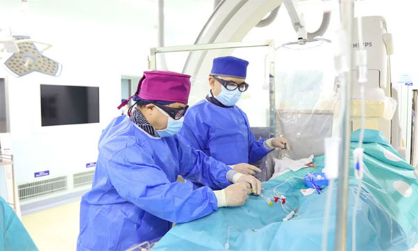 近日,席剛明教授與王貴平博士順利為一位多處頸動脈重度狹窄、閉塞、串聯(lián)病變患者,分期實施了介入手術。一開始對患者病情進行綜合研判,決定采取分期手術方式,有利于頸動脈閉塞遠端血管逐漸恢復,相應顱內(nèi)血流也逐步開放,降低手術并發(fā)癥風險,從根本上解除患者因頸內(nèi)動脈重度狹窄引起的腦缺血癥狀,預防缺血性腦卒中的發(fā)生和復發(fā)。順利為患者進行了腦保護傘下右側頸動脈支架置入手術,經(jīng)皮右側頸動脈球囊擴張成形術。