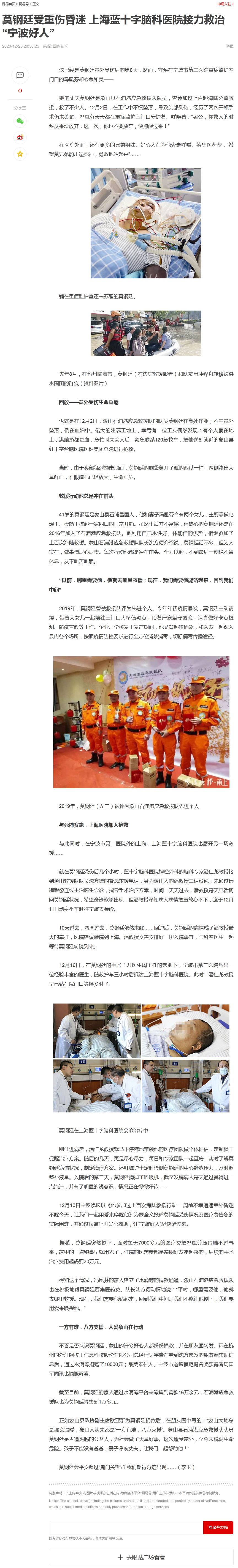 12月10日寧波晚報以《他參加過上百次海陸救援行動 一周前不幸遭遇意外昏迷不醒今天,讓我們一起用愛來喚醒他》為題全文報道莫鋼廷受傷情況及醫(yī)療費告急的實際困難,并通過報道呼吁愛心救助,讓“寧波好人”盡快醒過來。