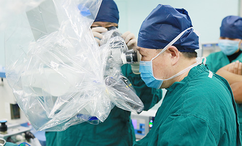 ▲李士其教授在德國蔡司雙熒光顯微鏡下為患者手術(shù)