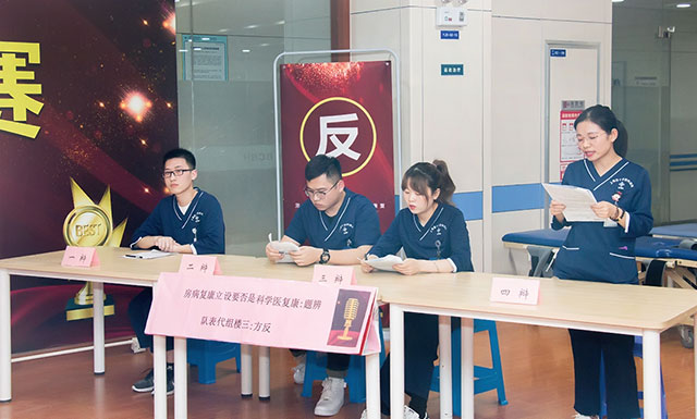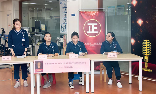 本次辯論賽主要分為三組,共6個(gè)代表隊(duì)(三個(gè)正方和三個(gè)反方)參加,主要圍繞康復(fù)醫(yī)學(xué)的三個(gè)熱點(diǎn)議題——1.康復(fù)機(jī)器人能否代替人工康復(fù)治療;2.康復(fù)醫(yī)學(xué)科是否要設(shè)立康復(fù)病房;3.根據(jù)我院情況需要OT、PT復(fù)合型治療師還是獨(dú)立型治療師,展開激烈的角逐。